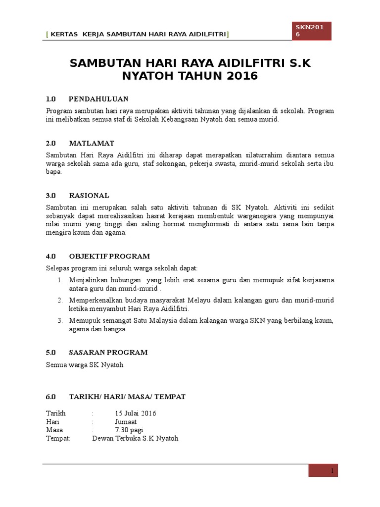 Kertas Kerja Sambutan Hari Raya Skn 2016 1 Pdf